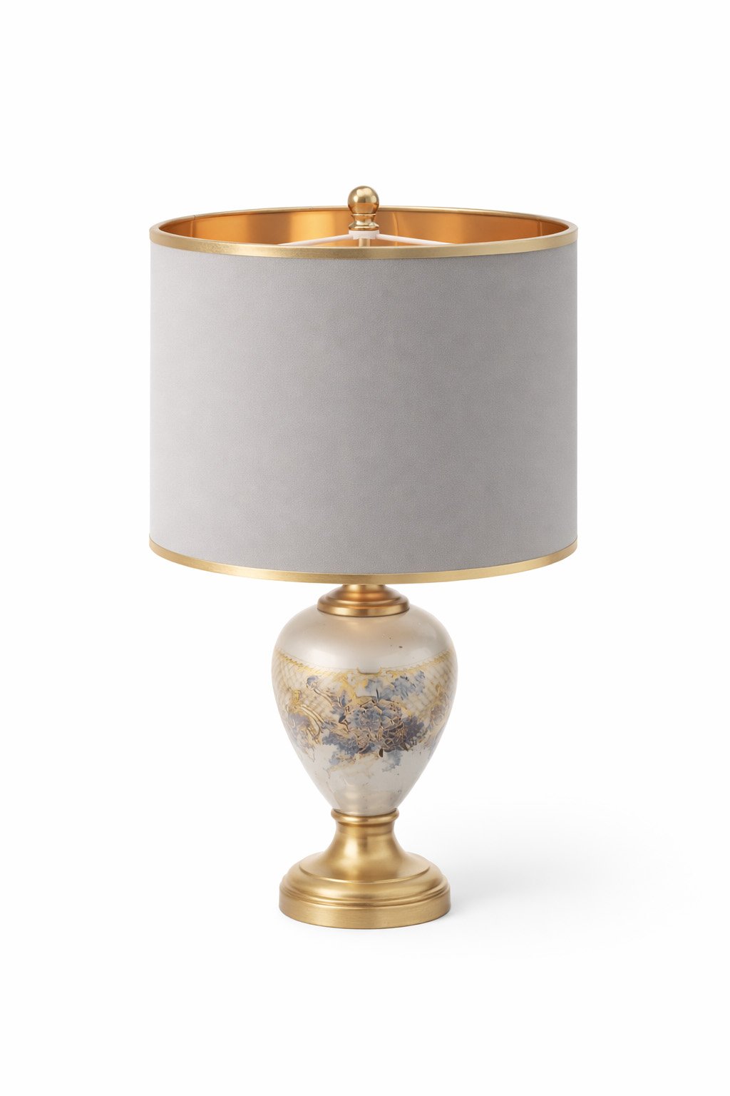 مصباح طاولة خزفي أنيق يتميّز بقاعدة مصممة بعناية مع نقوش فنية دقيقة ولمسات ذهبية راقية، إلى جانب غطاء قماشي ناعم يمنح إضاءة دافئة ومريحة. يجمع هذا المصباح بين الطابع الكلاسيكي والتفاصيل الفاخرة ليضفي لمسة من الأناقة على أي مساحة.