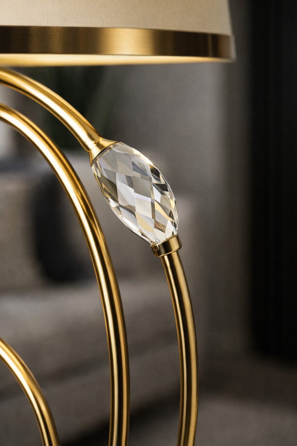 Crystal Bloom table lamp is a luxurious statement piece inspired by floral forms. Its elegant gold frame is adorned with crystal accents that reflect light beautifully, while the soft fabric shade creates warm ambient lighting, ideal for refined living spaces.